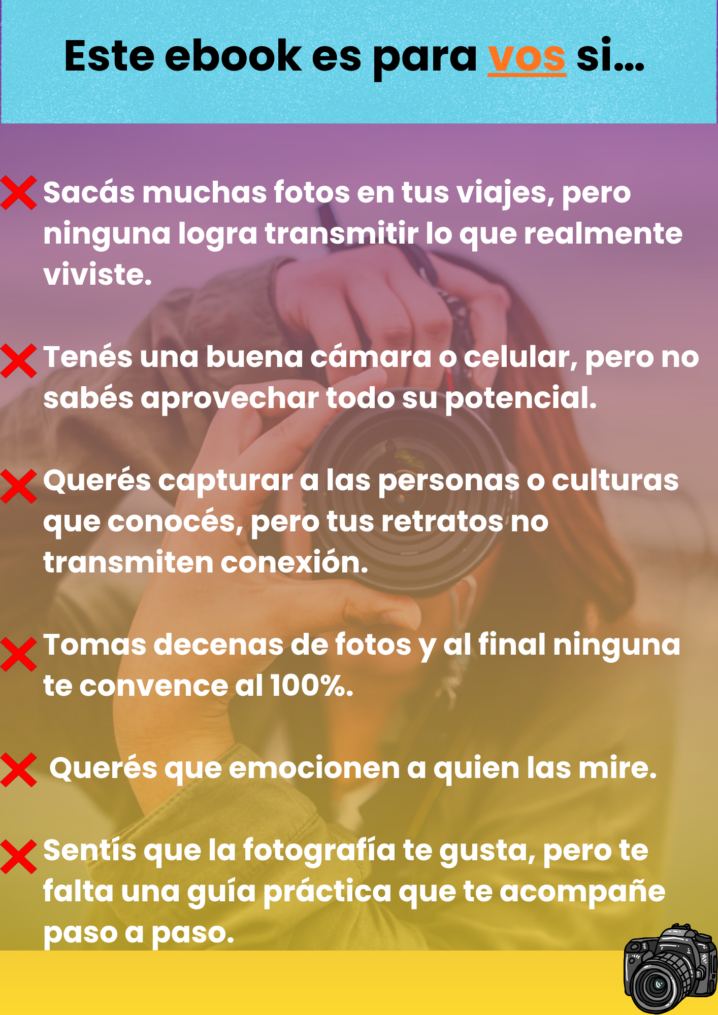 ¡Para nada! Este ebook fue creado para principiantes y viajeros curiosos, con explicaciones simples y ejemplos visuales. Vas a aprender paso a paso, desde cómo entender la luz hasta cómo capturar emociones en tus fotos.
