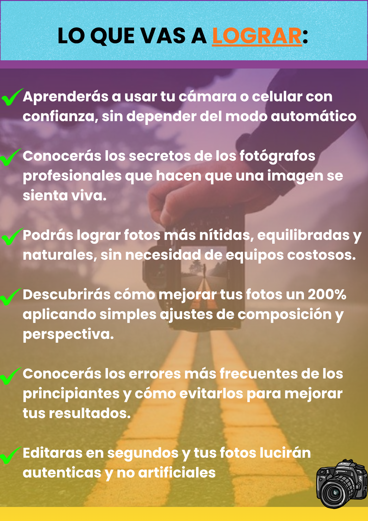 En menos de 7 días vas a notar un cambio real en tus fotos y en tu manera de mirar el mundo. Solo dedicando unos minutos por día, vas a empezar a sacar imágenes mucho más nítidas, equilibradas y expresivas.